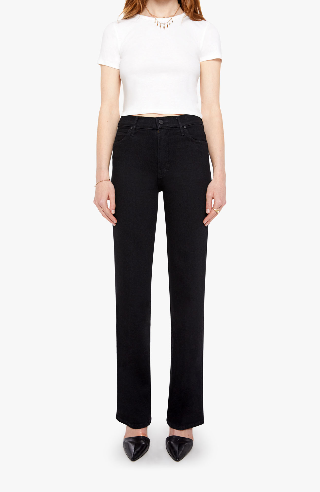 Lights out. A high-rise straight-leg jean with a 32-inch inseam and a clean hem. Made from stretch denim, Nighty Night is a true black with tonal hardware.