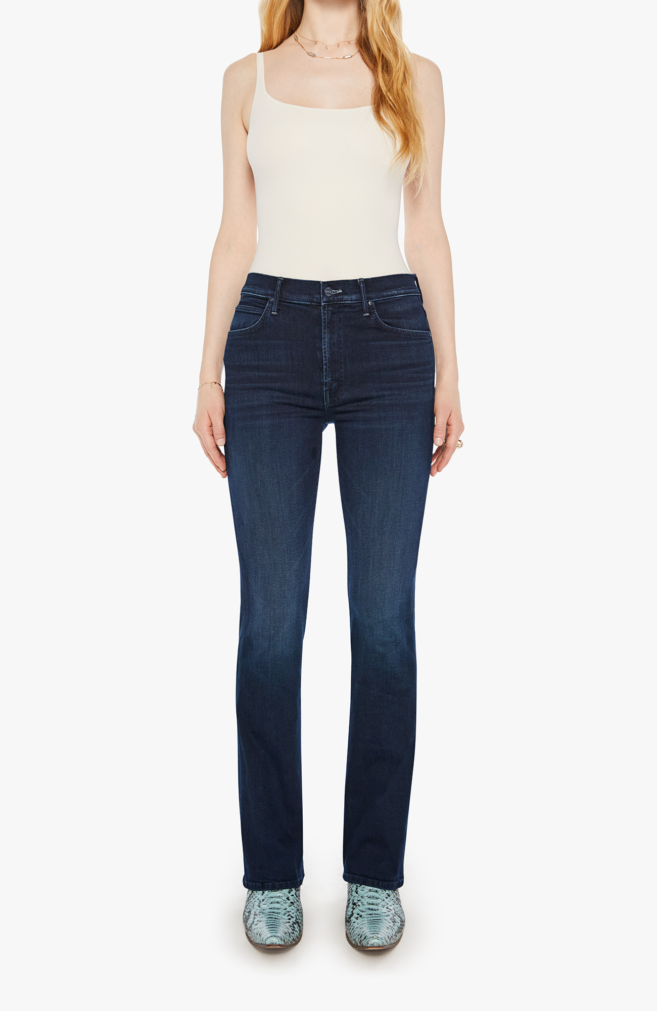 Change your tune. Mid-rise jeans with a flared leg, zip fly and a long 31-inch inseam with a clean hem. Crafted from soft stretch denim, Karaoke In Kyoto is a dark blue with subtle fading and whiskering.
